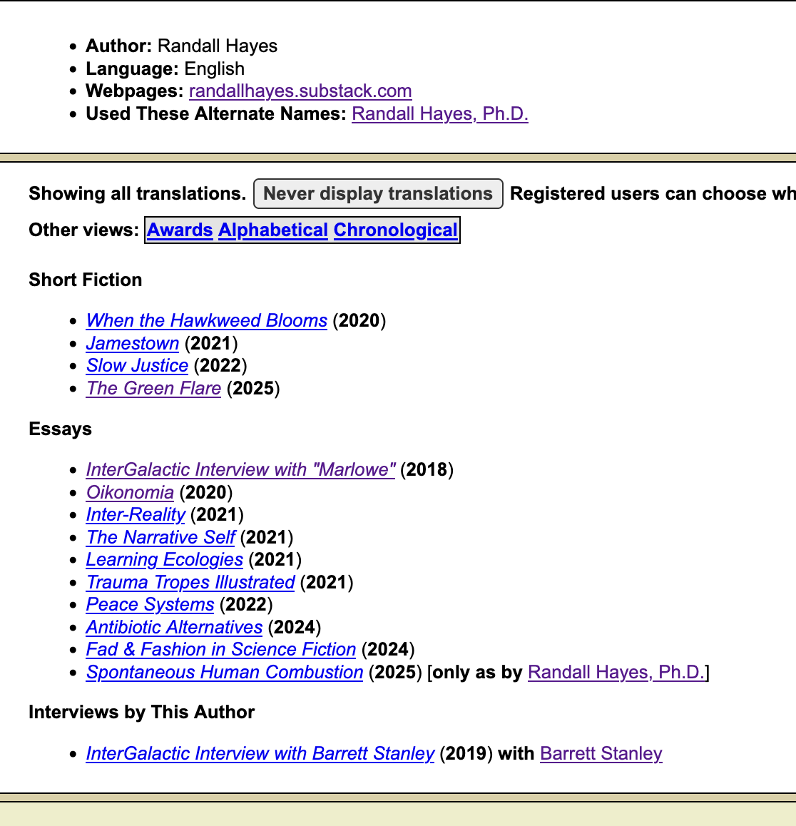I also just this fall started engaging with the Internet Speculative Fiction Database for the first time, and to my surprise and delight found that I already have an entry there! It is nowhere near complete, and there might be a couple of mistakes in categorization, but I do plan to make some efforts towards extending and correcting, once I figure out how.