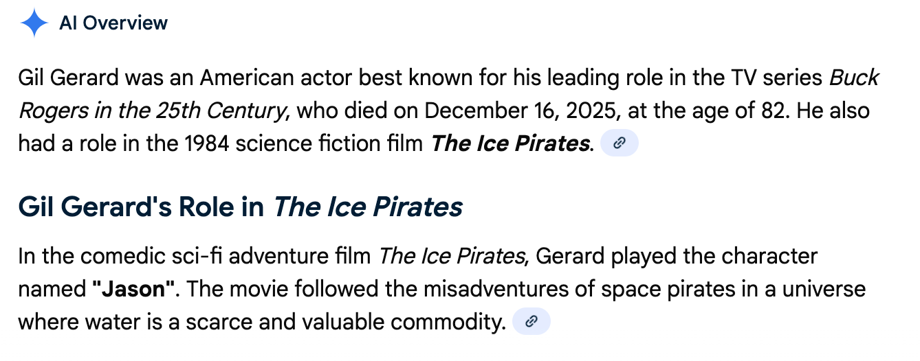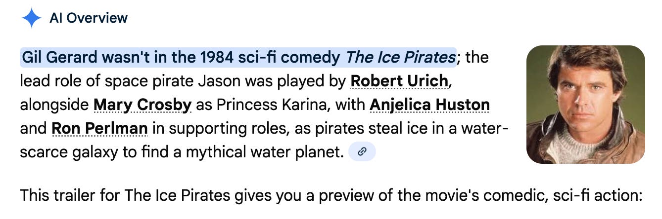 As an aside, I experienced my first obvious AI hallucination. When I typed “Gil Gerard pirate” into Google, its annoying top-of-the-feed box told me that he was in the 1984 movie Ice Pirates, which I have never seen.