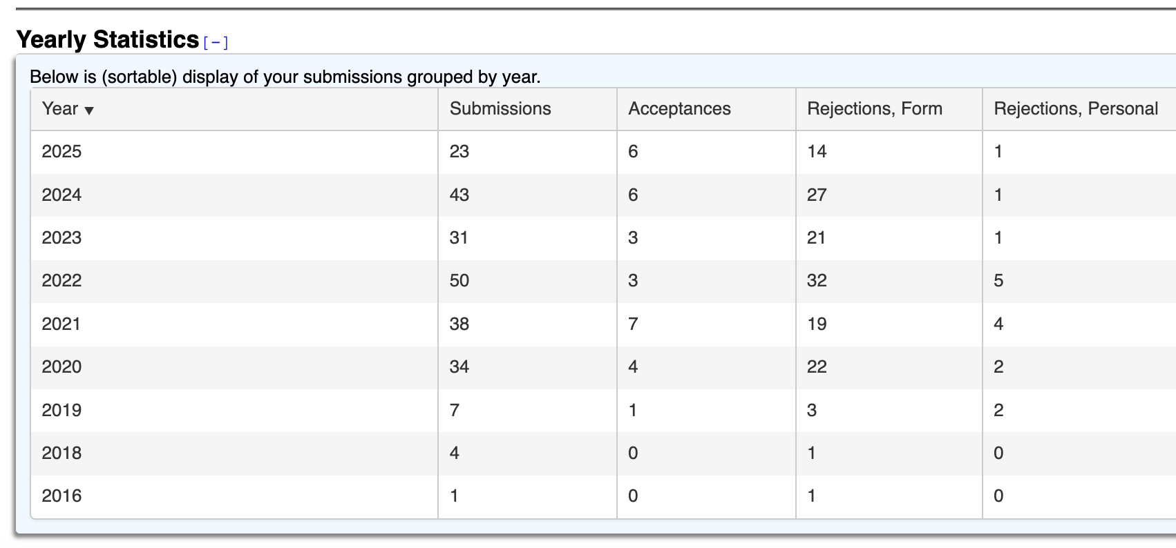 At first glance, it looks like I haven’t done much this year, creatively, but we have to take into account that the Lunar Awards and some of the other places I’ve sent stuff are not listed on the Submission Grinder. So my actual stats are probably in the high 20s / low 30s for submissions and rejections both.