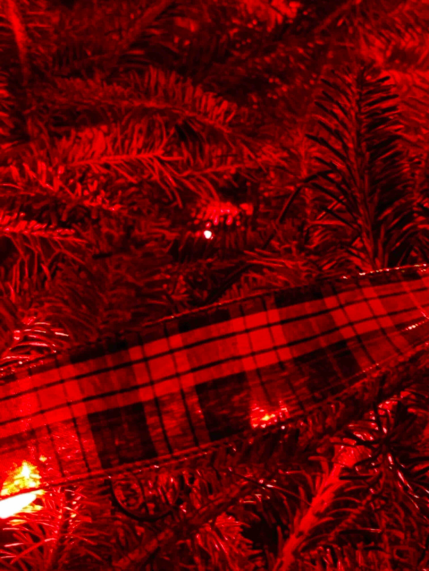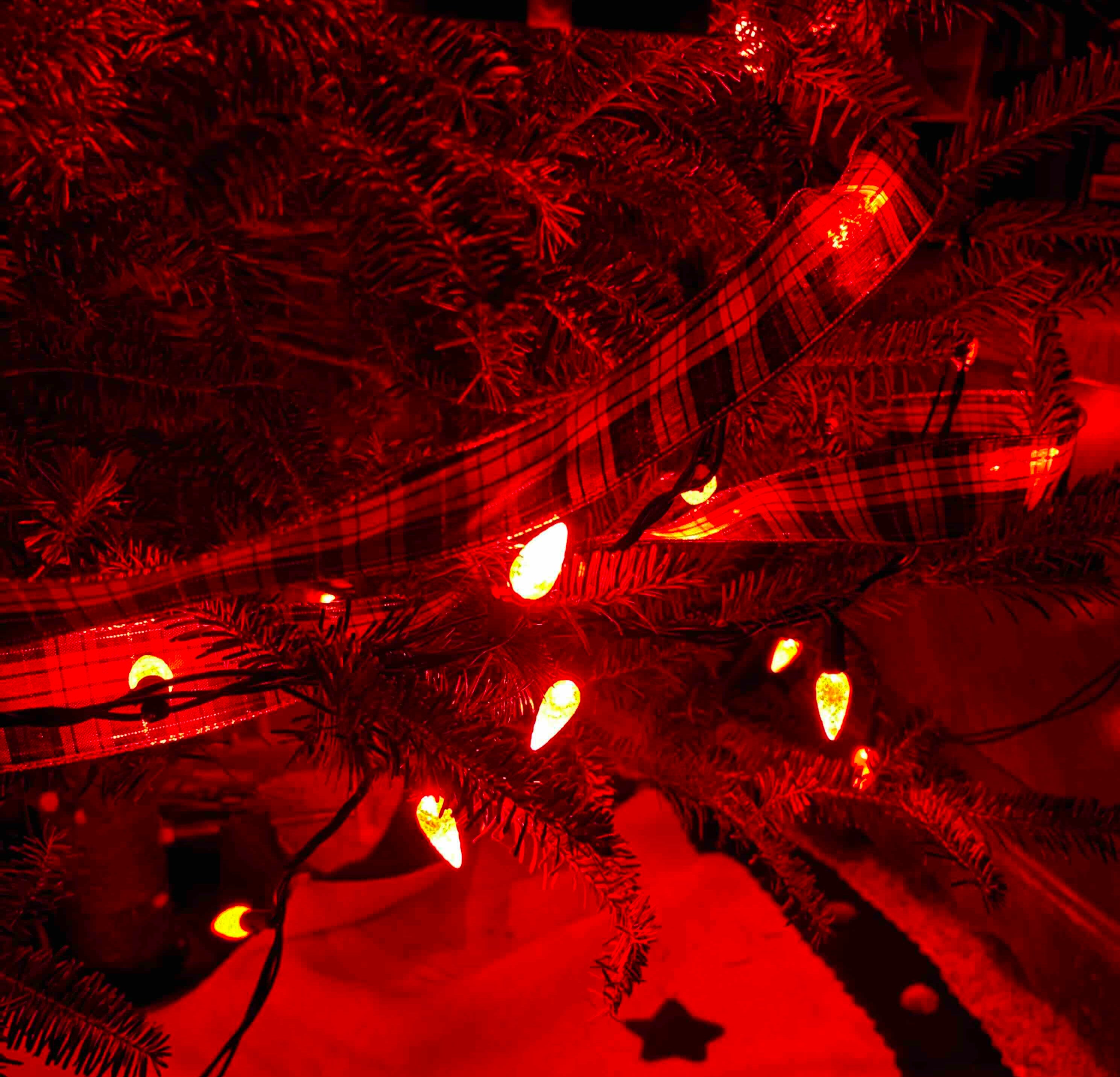 By mutual adult anti-capitalist consent, my wife & I gave each other Merlefest tickets this year, so there was no pile of emotional placeholder stuff under the tree. She also went minimal with the decorations, only a single string of red LED lights — warm in color but not in temperature, so they can stay on all night if we want — and one long strip of some thin, sheer, gold-threaded tartan cloth.