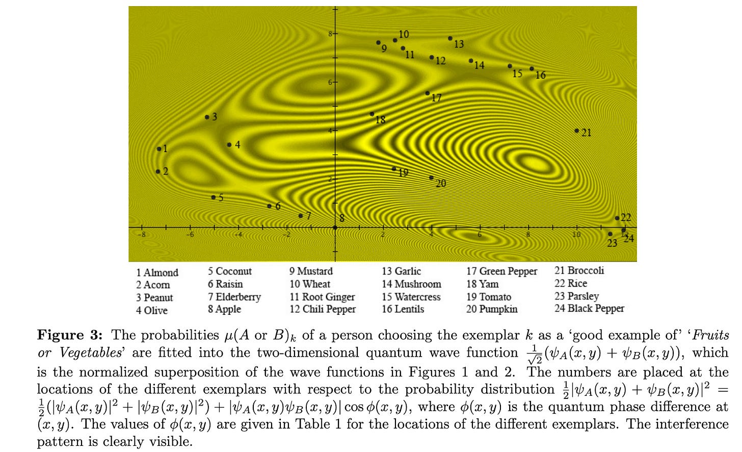 This means that some concepts are ‘stronger’ than we would expect them to be, and others are ‘weaker’. In other words, while every one of these things (except #14, mushroom) actually is a plant, and most of them are botanically fruits, our everyday concepts of them as Food or Fruits or Vegetables cluster based on our social and cultural learning processes. Mushrooms grow out of the ground and don’t move, like plants, and so our analogy-making processes cluster them with plants, even though they are not green. Most “fruits” are sweet on the tongue because they have simple sugars in them.